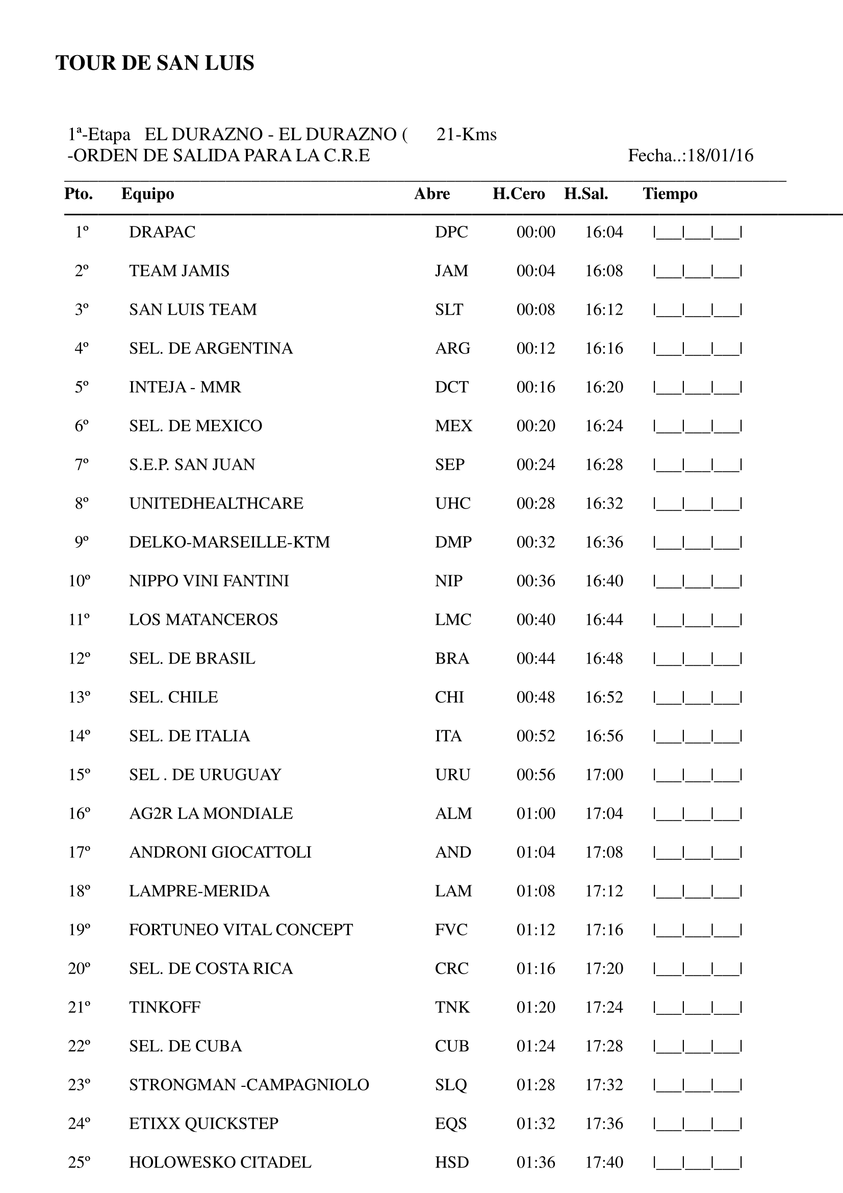 January 17 update: A work in progress for Tour de San Luis 2016 live and delayed coverage. Most live feeds will be country restricted, but unrestricted links will appear in bold. Check back at race time for more links. Feel free to send in additional sources for live video, tv coverage or text updates/tickers as they become known. — Steve| media source | tv or internet | comments/restrictions |
