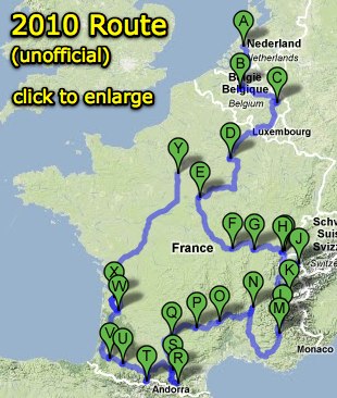 July 27 update: Now that the 2009 Tour is over, it's time to look ahead to 2010. We are one of the sites, that will provide you with a first glance of the 2010 route which is tradionally announced at the end of October each year. We'll start posting the facts and rumours about the 2010 route as they are announced and gleaned. Feel free to pass along anything you might know. — Steve